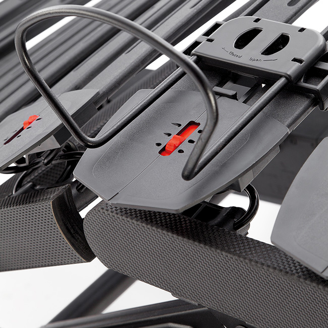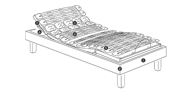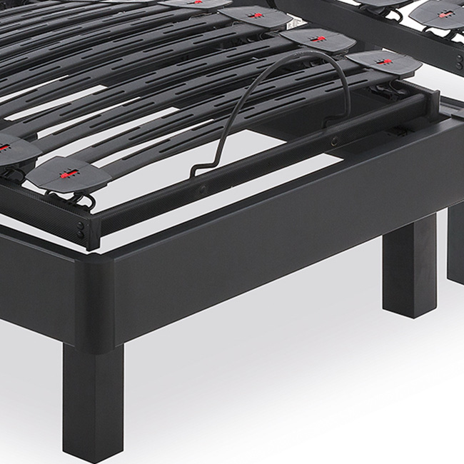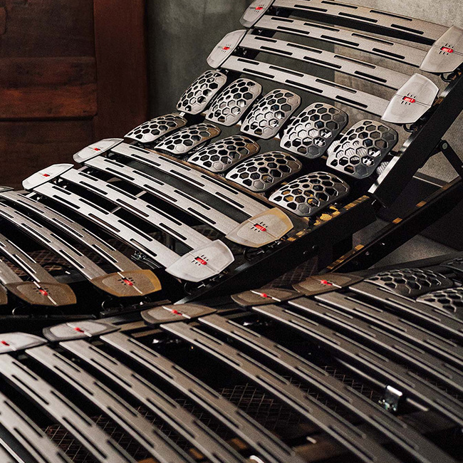 - Rótulas de Hytrel elástico y duradero, con diseño antideslizante que reduce el desplazamiento lateral del colchón y con regulador de 3 posiciones para ajustar la firmeza del lecho por zonas según el nivel de elasticidad deseado.