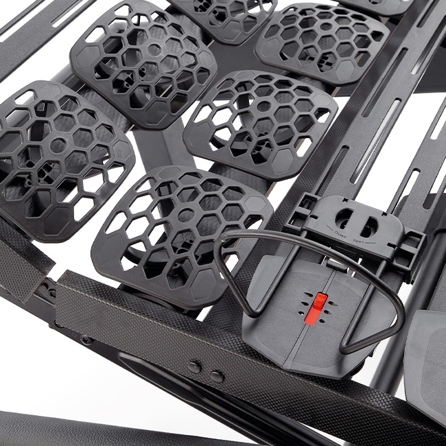 - Cinco planos de articulación, articulaciones y travesaños de madera laminada con mecanizado circular, que aportan estabilidad, resistencia al peso y acabado en imitación fibra de carbono.