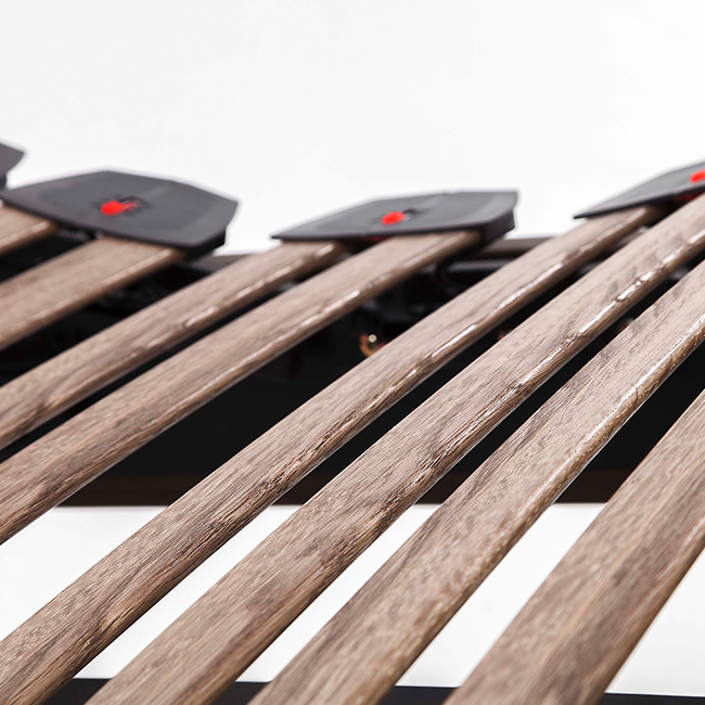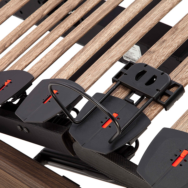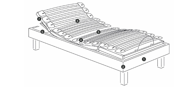 - Rótulas de Hytrel elástico y duradero, con diseño antideslizante que reduce el desplazamiento lateral del colchón y con regulador de 3 posiciones para ajustar la firmeza del lecho por zonas según el nivel de elasticidad deseado.