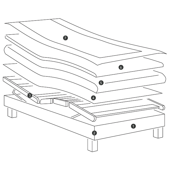 - Cuatro planos de articulación disponemos de articulaciones de madera laminada, que crean un lecho uniforme y estable, minimizando el desgaste en zonas móviles con travesaños de madera laminada de haya que refuerzan el movimiento y soportan el peso.