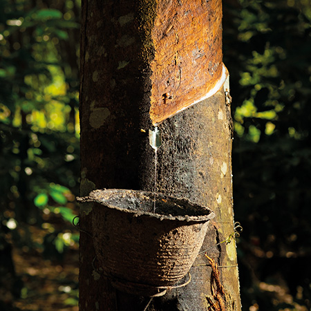 El látex natural proviene del árbol Hevea Brasiliensis, se extrae mediante un proceso controlado llamado “sangrado”. Este proceso consiste en realizar cortes superficiales en la corteza para recolectar el látex sin dañar el árbol, permitiendo obtener un material de alta calidad respetando el ecosistema y la longevidad del árbol.