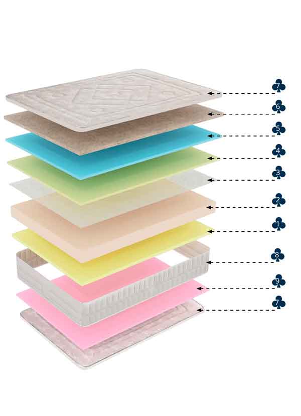 1. Capa de espuma visco elástica, de alta densidad y transpirabilidad debido a su poro abierto, que mantiene características físicas inalterables a los cambios de temperatura, dando la sensación de ingravidez, suave y envolvente, como una nube.