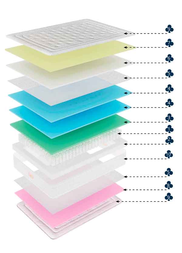 1. Núcleo de muelles ensacados que se ajusta de manera óptima al peso y los movimientos de cada persona, con un alto nivel de transpirabilidad, ofreciendo un descanso cómodo y estable.