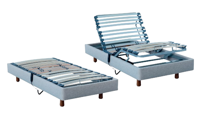 Estructura en tubo de acero 50 x 20 mm esmaltado epoxi termo-endurecido. Lecho en tubo de acero 30 x 20 mm esmaltado en epoxi termo-endurecido. 24 lamas en madera de haya natural contrachapadas flexibles. Las lamas en madera de haya son de mayor calidad, y resistencia soportando mejor la humedad y el peso ejercido sobre ellas. Lamas montadas, sobre soporte Hytrel, oscilantes dobles, que ofrecen gran elasticidad y resistencia a la deformación. Permiten que las lamas puedan adaptarse a los diferentes pesos del cuerpo. Cinco planos de articulación. Plano lumbar fijo, que a su vez incorpora doble lama, y cursores especiales para la regulación de firmeza que al moverlos a través de las lamas, nos permiten variar la firmeza, alejando los cursores entre sí se obtiene más firmeza, acercándolos menos, por tanto, más adaptabilidad.