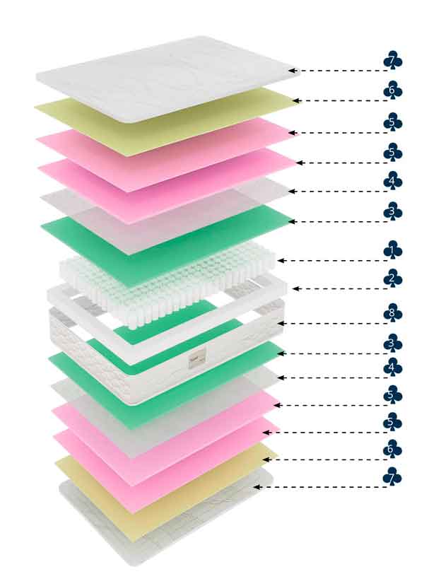 1. Núcleo de muelles ensacados que se ajusta de manera óptima al peso y los movimientos de cada persona, con un alto nivel de transpirabilidad, ofreciendo un descanso cómodo y estable.