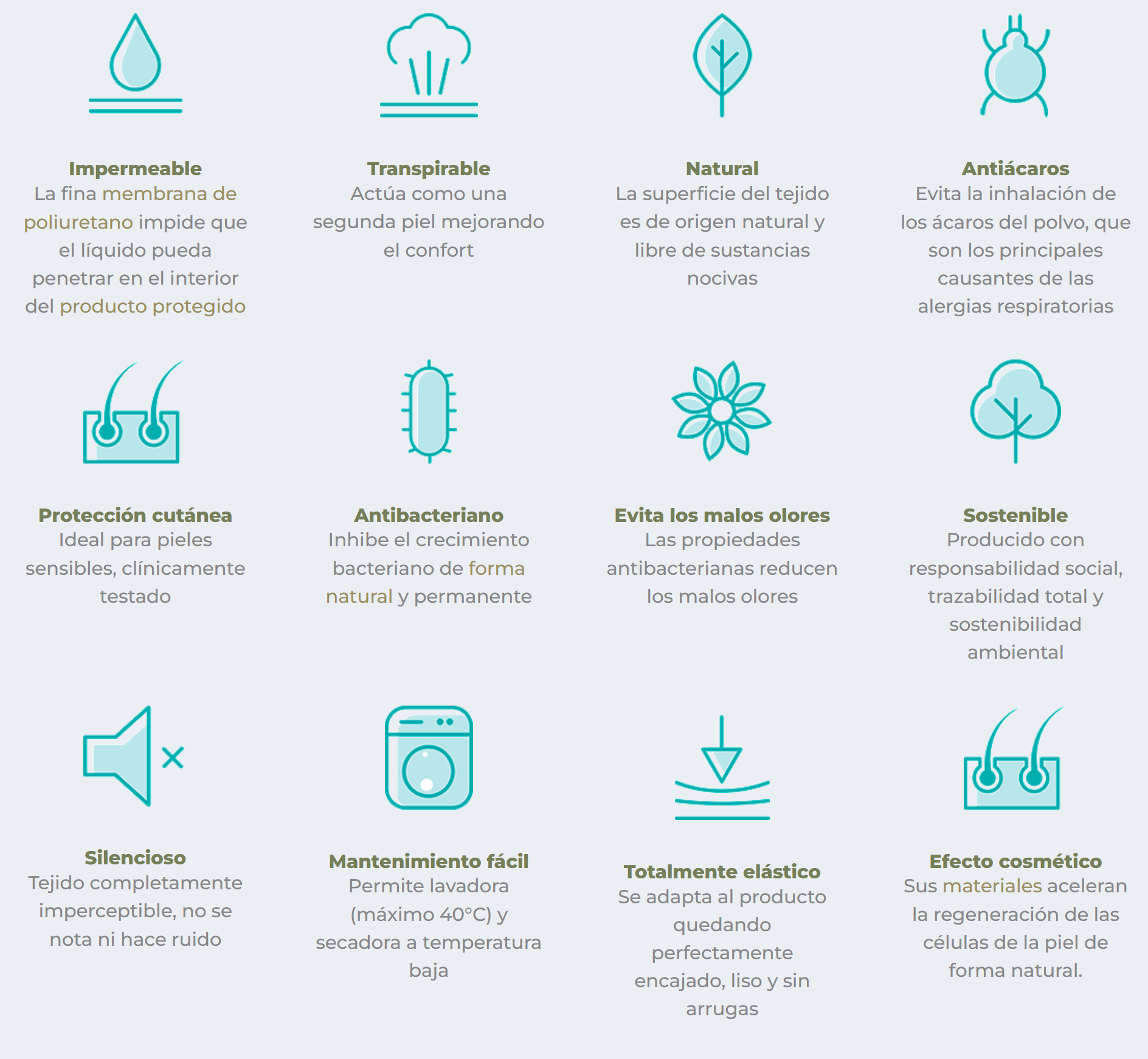 Es una funda de almohada fresca, impermeable y transpirable que también protege la almohada. Rendimiento permanente gracias a la combinación de fibras, incluso después de muchos ciclos de lavado.
