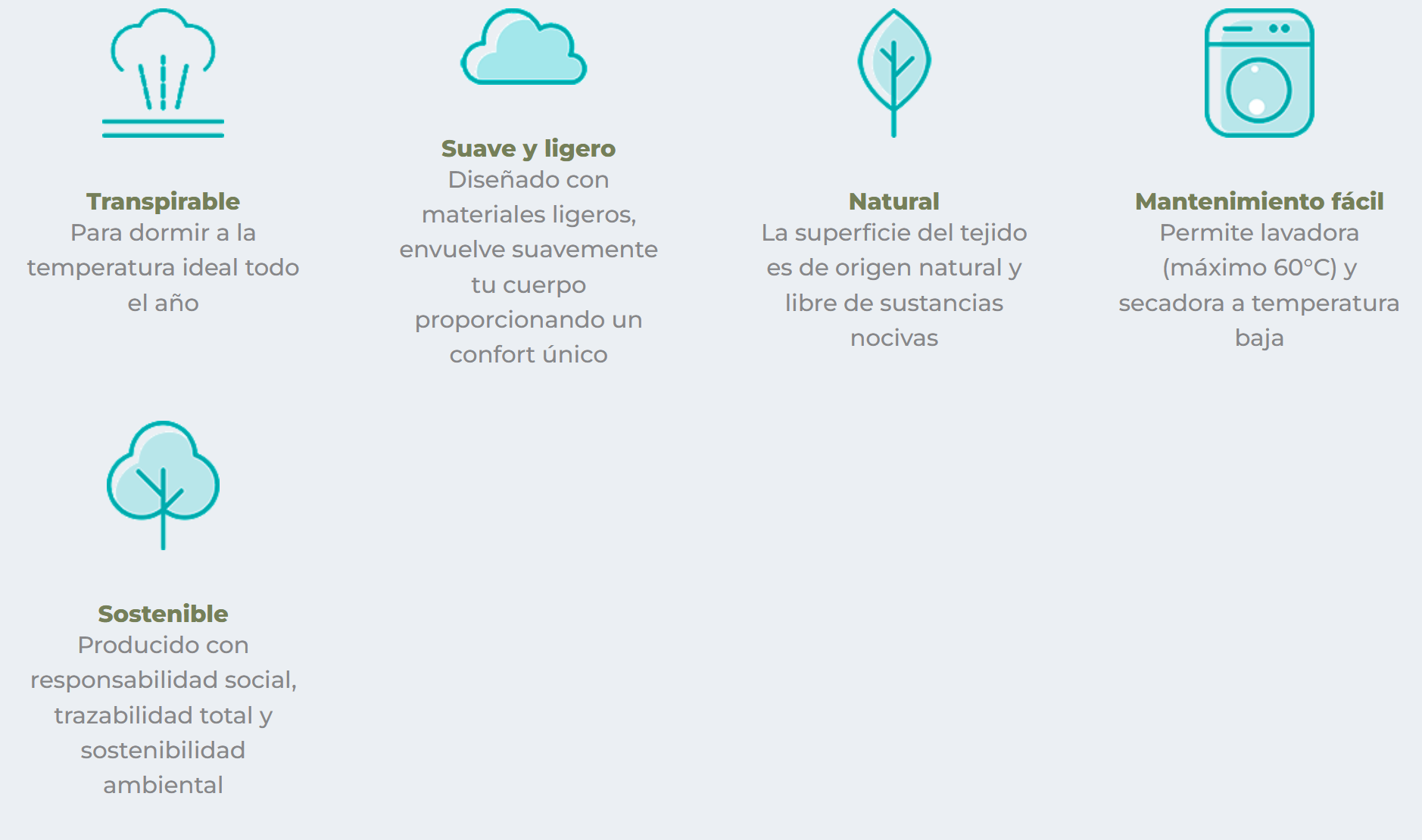 Da la bienvenida a noches agradables con la mezcla de la fibra sostenible TENCEL™, la que más cuida tu piel, presente tanto en el relleno como en la cubierta.