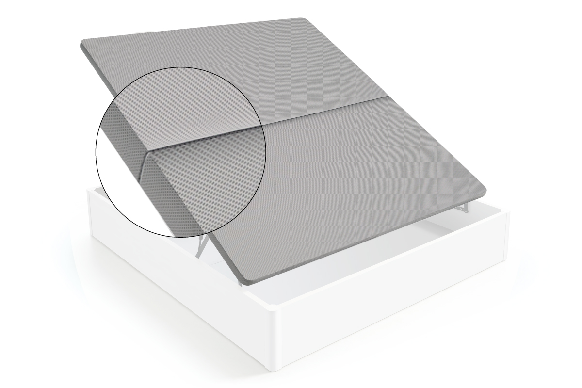 Space con tapa partida 3d está diseñada para que puedas guardar de manera espaciosa y segura su almacenaje. Su esquina es redondeada adaptada al colchón y lleva incoroporada una bisagra con tapa partida. Su somier es metálico y su pata es de madera maciza creada a juego de su costado.