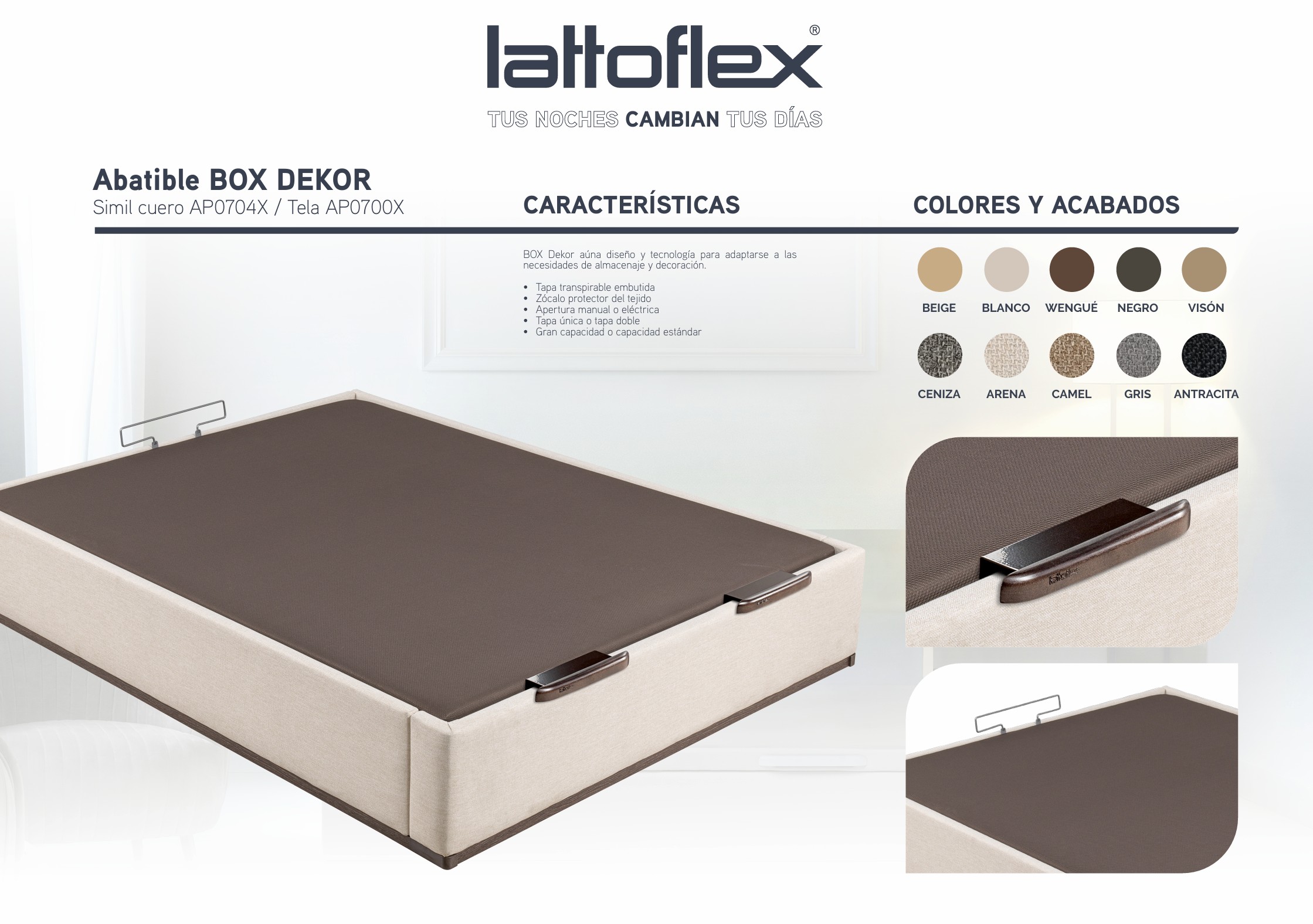 El abatible Box Dekor combina funcionalidad y diseño, obteniendo el máximo almacenaje sin perder de vista el aspecto estético. Las diversas posibilidades de configuración permiten ofrecer un modelo acorde a las preferencias de cada usuario.
