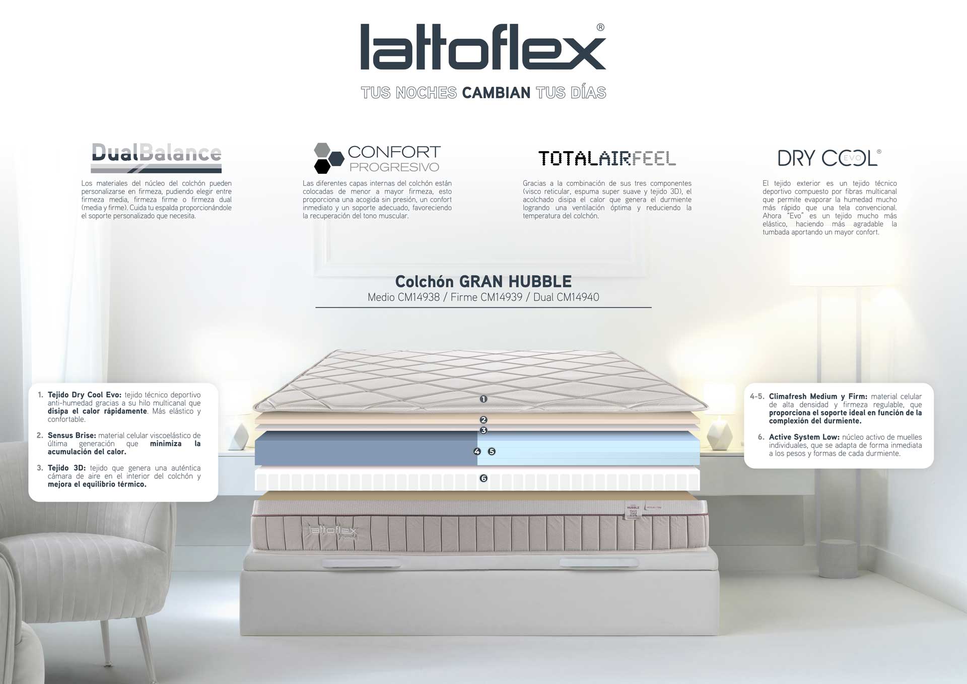 • El colchón Gran Hubble incluye las siguientes tecnologías Lattoflex: tejido Dry Cool Evo, Confort Progresivo, Dual Balance y Total Air Feel.