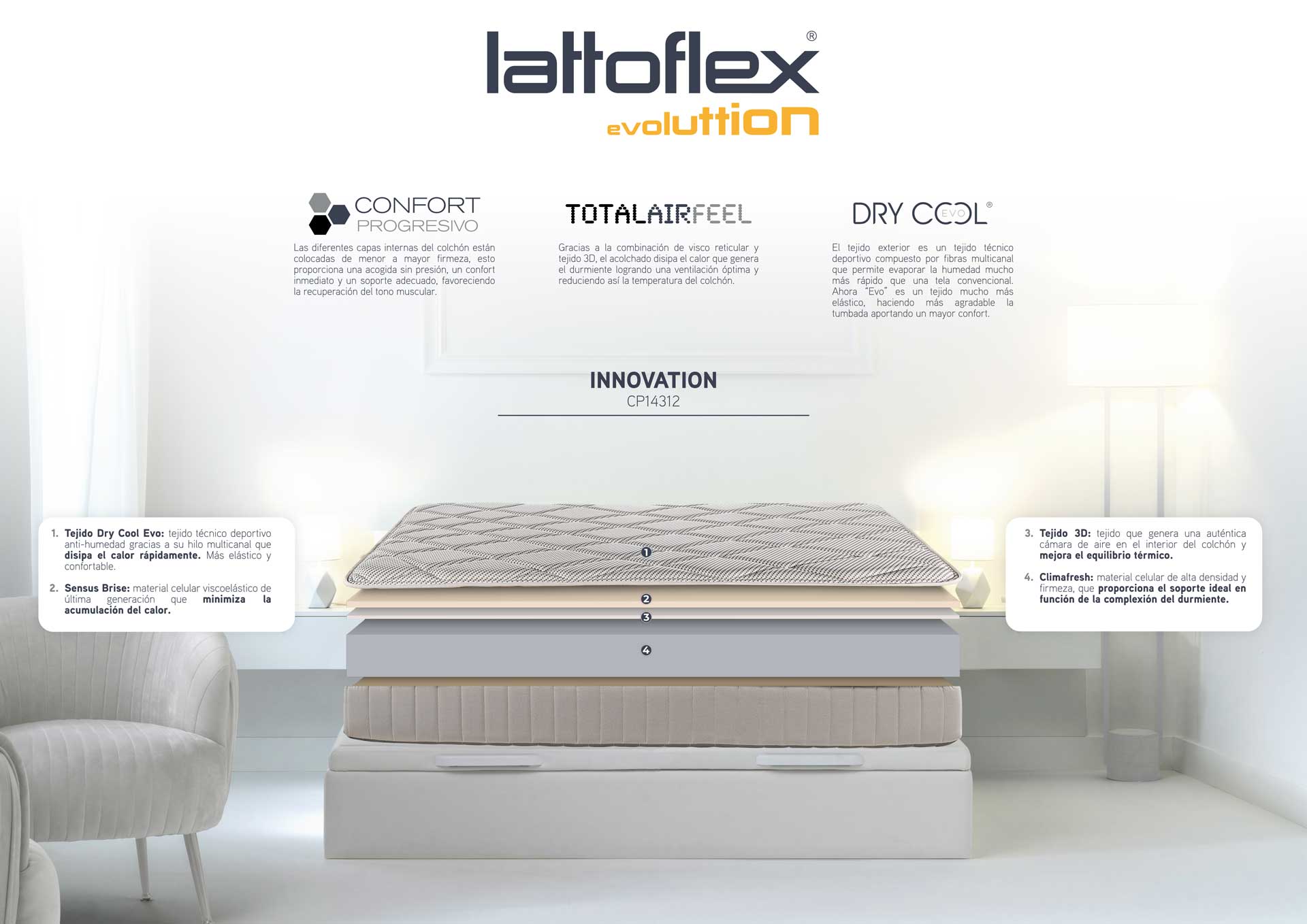 • El colchón INNOVATION incluye las siguientes tecnologías Lattoflex: Dry Cool Evo, Confort Progresivo y Total Air Feel.