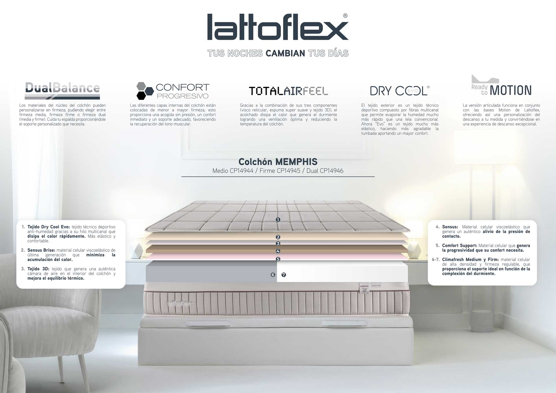 • El colchón Memphis incluye las siguientes tecnologías Lattoflex: tejido Dry Cool Evo, Confort Progresivo, Dual Balance y Total Air Feel.