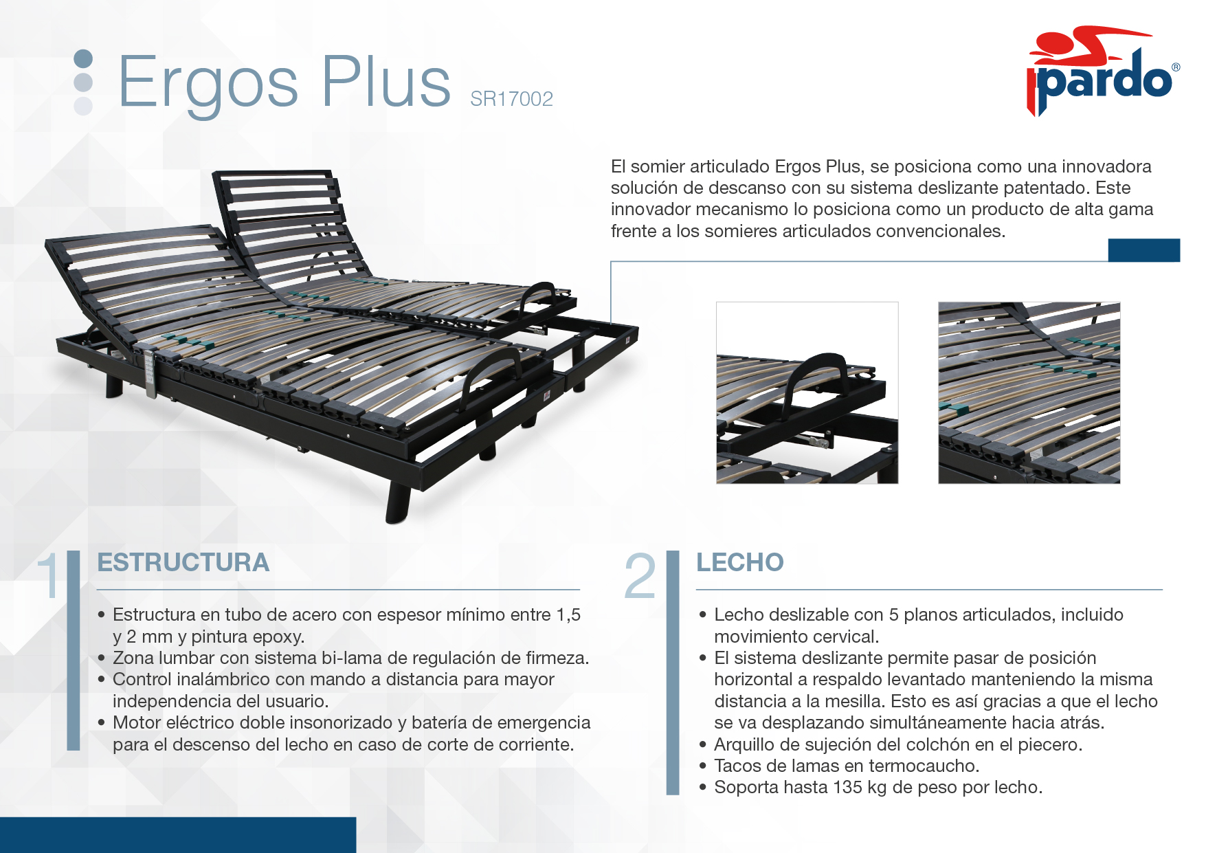 El somier articulado Ergos Plus, se posiciona como una innovadora solución de descanso gracias a su sistema deslizante patentado. Este innovador mecanismo lo posiciona como un producto de alta gama frente a los somieres articulados convencionales.
