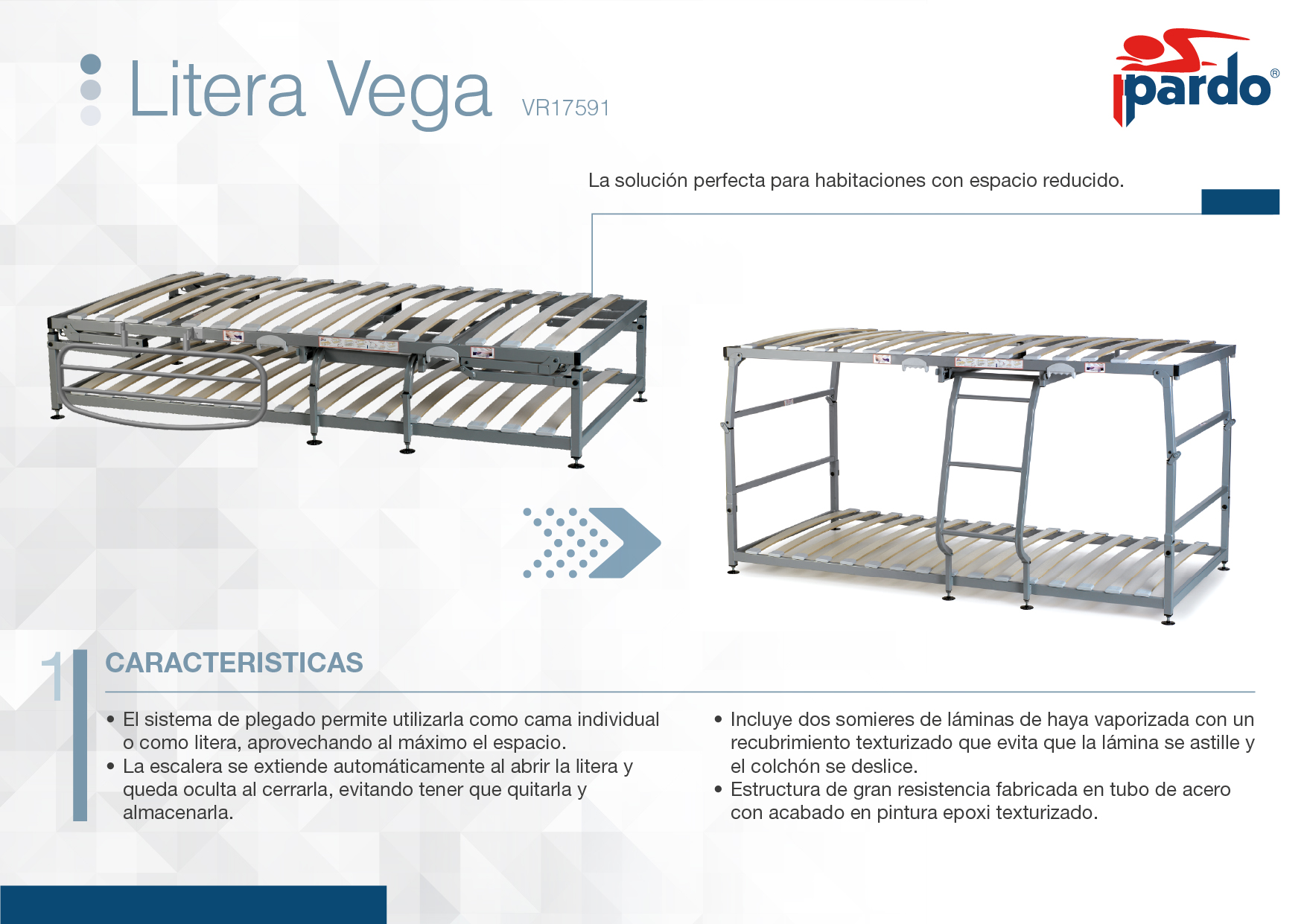 La litera Vega es la solución perfecta para habitaciones con espacios reducidos. Su diseño plegable optimiza el uso del espacio, permitiéndote tener dos camas en una, siendo ideal para dormitorios juveniles, pequeñas estancias, albergues, hoteles y/o apartamentos.