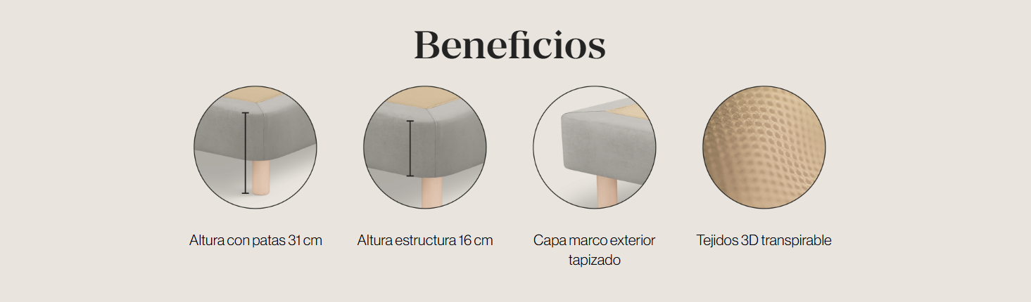 Classic es un canapé fijo con base rígida y diseño elegante de esquinas redondeadas que combinará a la perfección en tu dormitorio y será una apuesta segura para tu descanso. Con un marco robusto exterior con doble estructura metálica con acabados anticorrosión, se apoya al suelo mediante una selección de patas de 15 cm de altura para combinar a tu gusto.