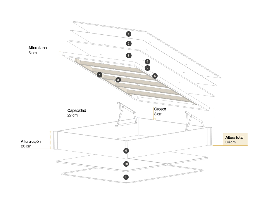 Siluet combina todas las características que buscas en un canapé abatible. Su capacidad, de 27 cm, es el extra de almacenamiento que necesitas, mientras que su diseño, con patas esquineras de madera maciza, le aportan un estilo único. Su fondo de aglomerado de 12 mm le otorgan una garantía de robustez y durabilidad.