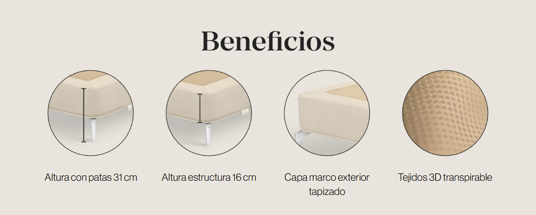 Supreme es un canapé fijo con base rígida y diseño elegante de esquinas redondeadas y con un acabado en cordón, que combinará a la perfección en tu dormitorio y será una apuesta segura para tu descanso. Con un marco robusto exterior con doble estructura metálica con acabados anticorrosión, se apoya al suelo mediante una selección de patas de 15 cm de altura para combinar a tu gusto.
