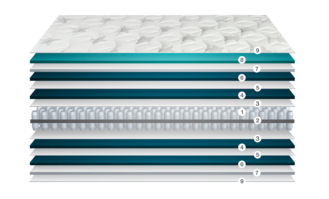 Tejido Strech de alto gramaje con tratamiento anti bacterias y anti ácaros. Acolchado con tecnología de última generación con sistema continuo multiagujas.